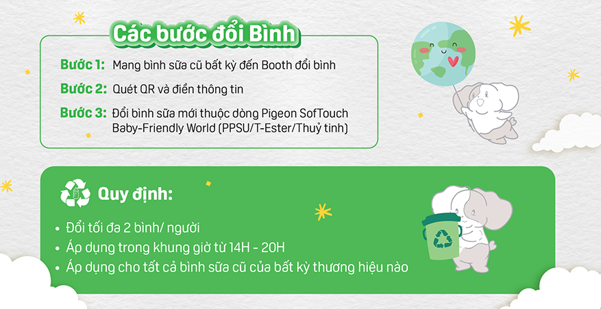 Khi tham gia chương trình, mẹ chỉ cần mang bình sữa cũ (áp dụng cho tất cả thương hiệu) đến “Trạm Xanh Pigeon”, mẹ sẽ nhận ngay những ưu đãi đặc biệt: